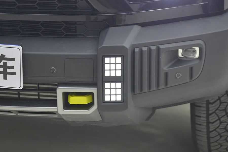 前杠皮上有两个荧光绿色的拖钩,这可不是真拖钩,实际上只是一个装饰。脱钩旁边有两组“九宫格”LED灯,很有“后现代”风格。
