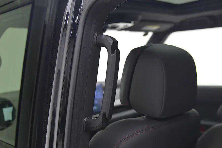 A柱B柱位置都设计有把手,A柱及顶棚都是翻毛皮包裹,有点高级感。