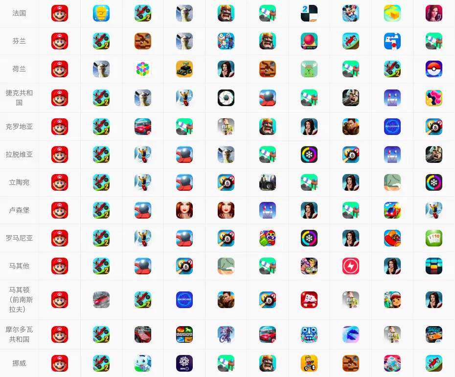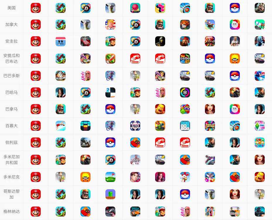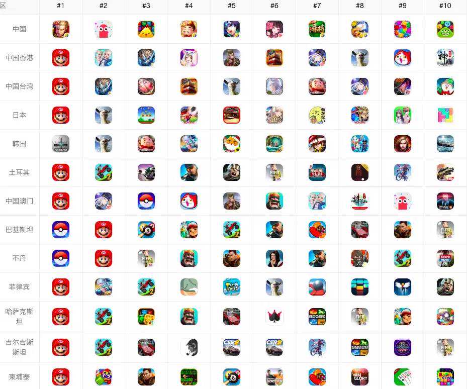 葡萄君截取了部分国家游戏免费榜,大家自行体会下: