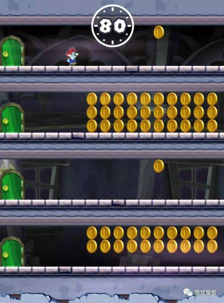 紫币的位置更加刁钻。如下图,玩家需要在踩踏怪物的一瞬间长按屏幕,才能吃到紫币: