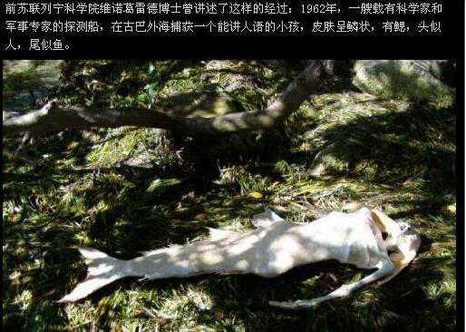 173厘米,腰部以上像人类头部发达脑袋体积相当大双手有利爪,眼睛跟其他鱼类一样,没有眼皮,儿科学家相信他死的时候大约有100多岁的年龄,从他们掌握的证据来看。美人鱼并不是传说,或是虚构出来的生活,而是世界上确实存在的一种生物,换句话说,这个世界上确实有美人鱼,只是我们生活习惯的巨大差异,或者说是由于身体组织的巨大差异,在我们人类的生活圈里。人鱼只是比较罕见而已,其实多年以来,海洋生物学家,动物学家和人类学家做了大量的研究工作,就在前不久,俄罗斯科学院的维葛雷德博士透露出了一个惊人的秘密,1962年,一艘苏联。货船在古巴外海莫名其妙地沉没了,由于船上载有核导弹,于是苏联派出了再有科学家和军事专家的探测箭前去搜寻沉船,试图捞回核导弹探测舰来到沉船海域利用水下摄影机巡回死。