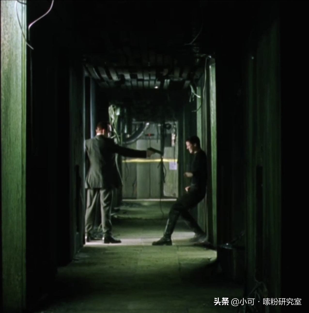 正当Smith给Morpheus宣讲他所悟到的“人类病毒论”,并摘下耳机,暂时脱离和矩阵母体的连接,告诉Morpheus自己真正的想法——寻求真实时,Neo和Trinity已经身着黑色风衣,全副武装,用一阵酷炫吊炸天的枪战和格斗技杀入特工大楼总部,如入无人之境,大杀四方。