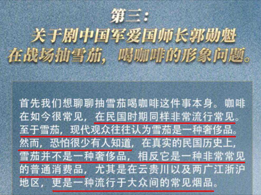 颇有意思的是,在回应广大观众和媒体的质疑时,亮剑3剧组在官方微博发布长文,对网上热议的情况进行说明。比如救护女队员的裙装问题,年轻演员是否适合出演八路军将领的问题,师长郭勋魁在战场上抽雪茄、喝咖啡的问题做了说明。并贴出很多旧雪茄老照片作为证明:
