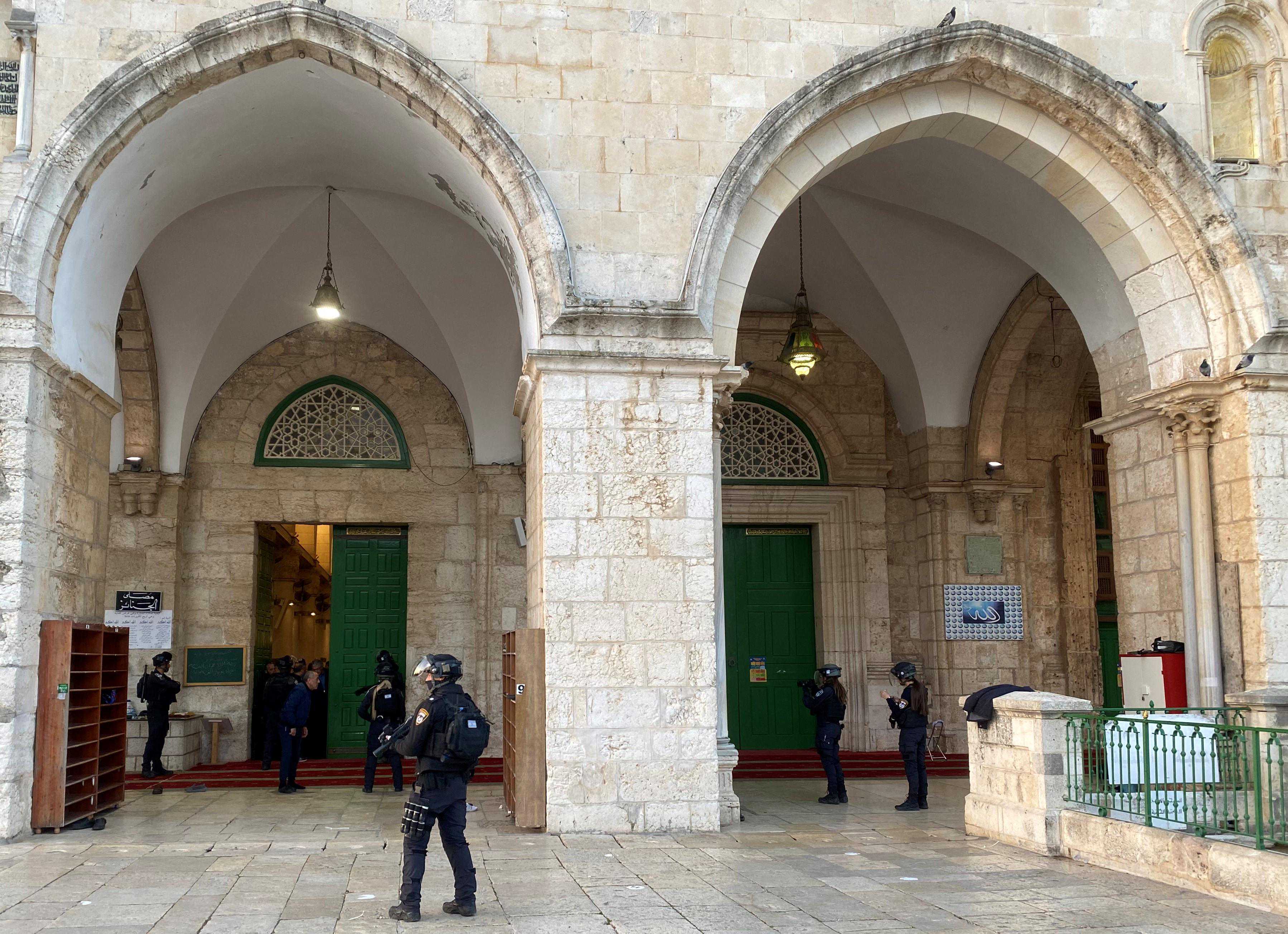 4月5日,以色列警察在耶路撒冷老城阿克萨清真寺执勤。新华社发(穆阿迈尔·阿瓦德摄)