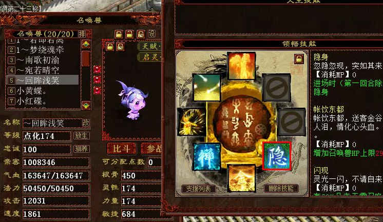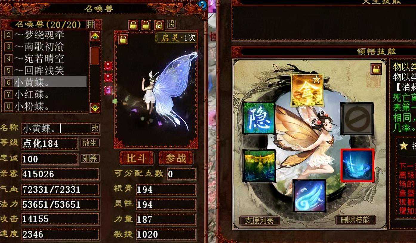 不知道是视觉问题还是其他的什么原因,一心怎么看,眼前这只蝴蝶仙子,是一只小黄蝶,看上去更像是一只紫蝶。每只蝴蝶上,都带着高级技能物以类聚。这操作倒是很值得借鉴,物以类聚,提高同造型召唤兽的闪现支援几率,很适合同造型多的召唤兽使用。