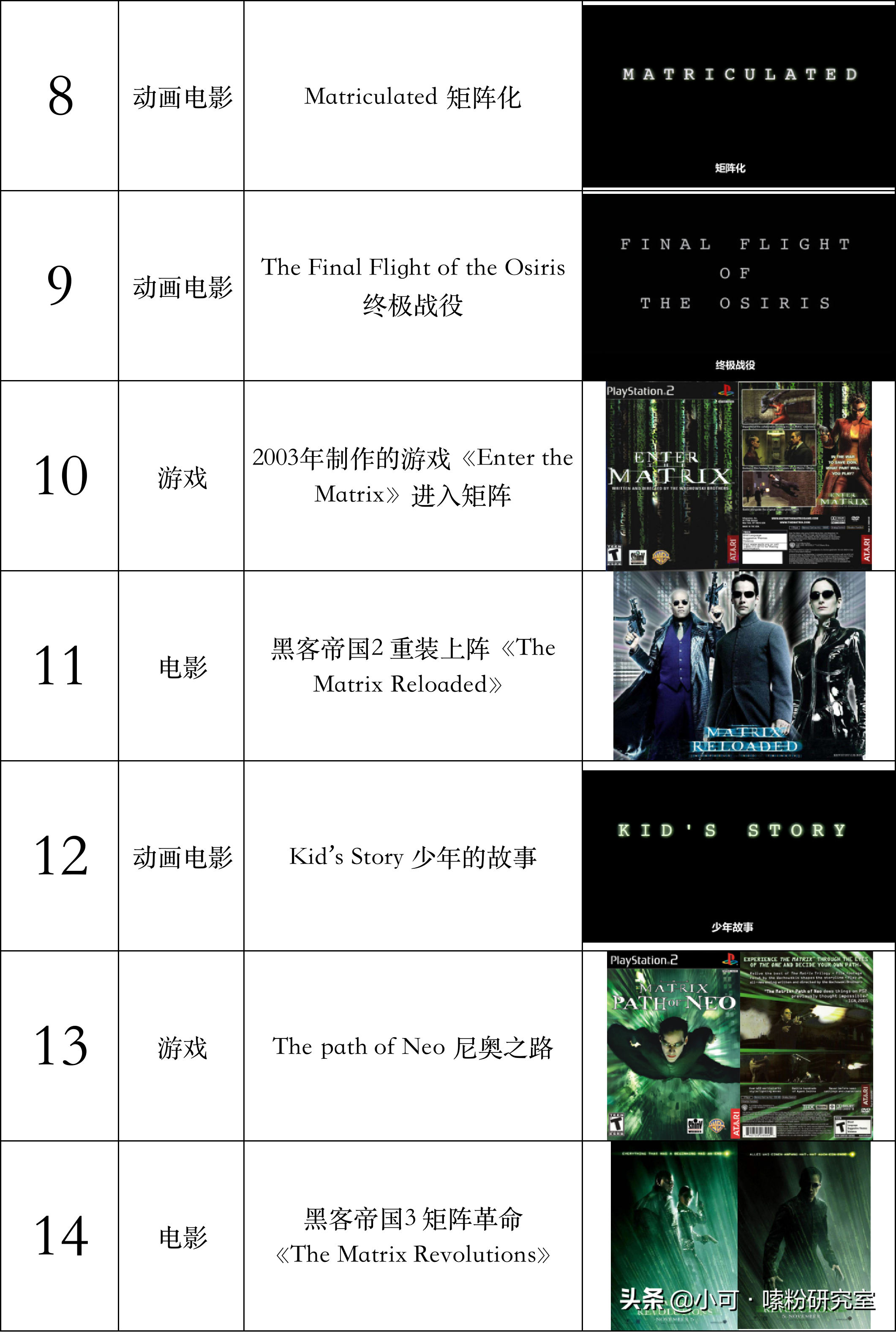 在《黑客帝国4》上映前,沃卓斯基兄弟已经导演制作了三部电影,参与制作了两部动作游戏和一部动漫电影。因此想要串联起整个黑客帝国的故事线以及剧情内容,需要一并看一看这些作品。