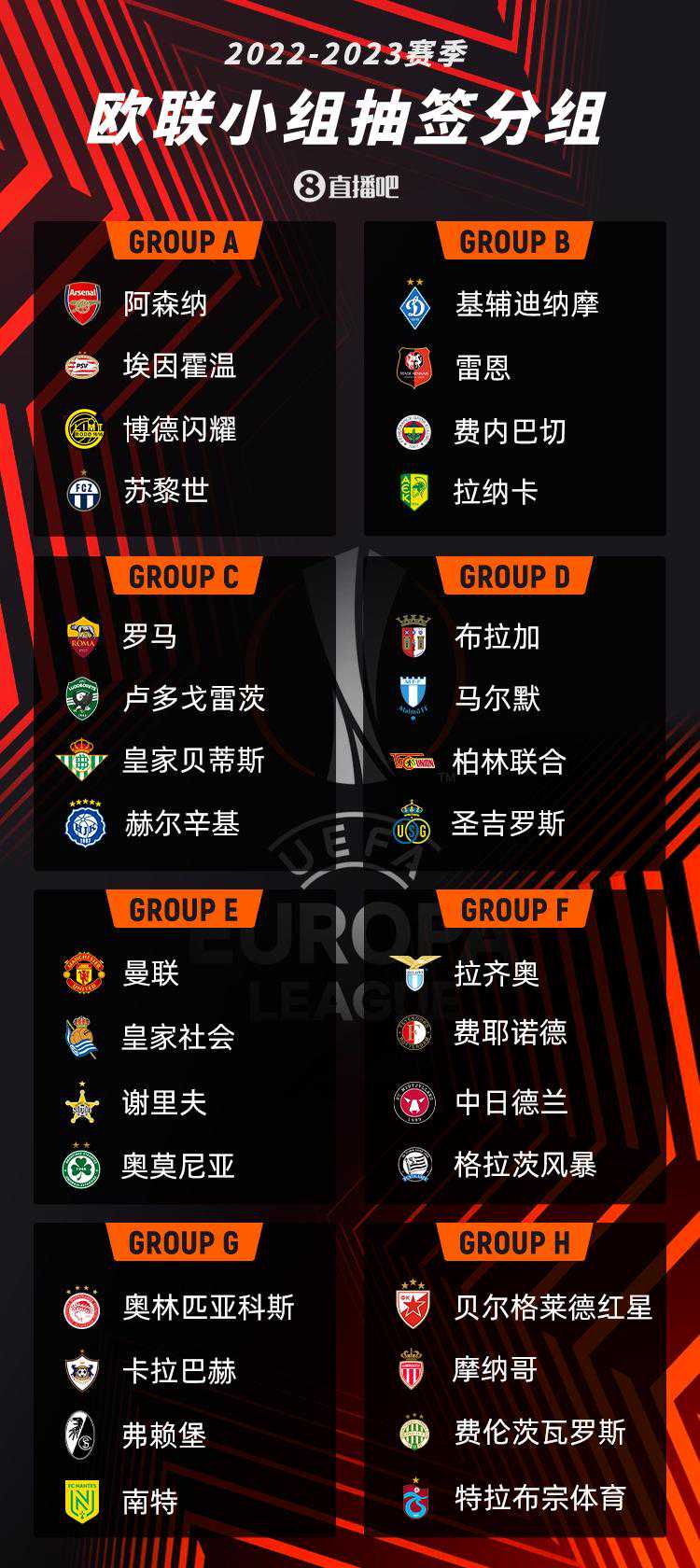 直播吧8月262022/23赛季欧联杯小组赛完整分组出炉。阿森纳碰上埃因霍温,曼联遭遇皇家社会,罗马对碰贝蒂斯。