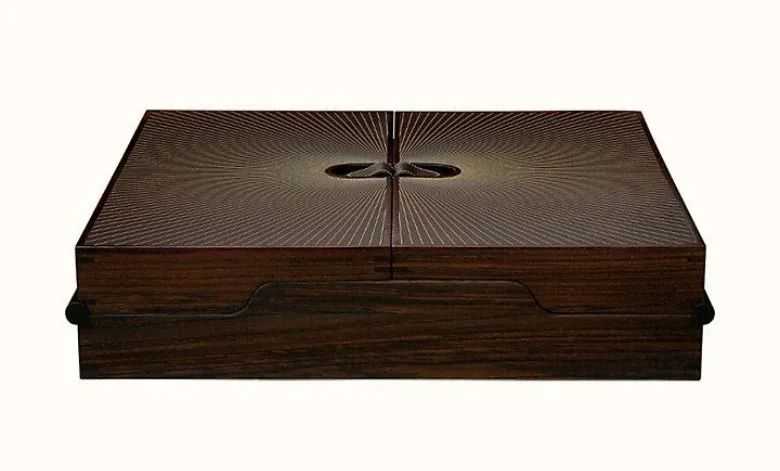 一款由奢侈品牌爱马仕Hermes旗下设计的麻将套装,该麻将套装采用深色红木为主的马达加斯加紫檀木为包装盒,并配有爱马仕标致性的小牛皮。Helios是标志着古希腊神话中太阳神的名字,盒子的外部线条呈现太阳的光芒,内部则是传统中式风水设计,并配有金色的骰子与风位牌。