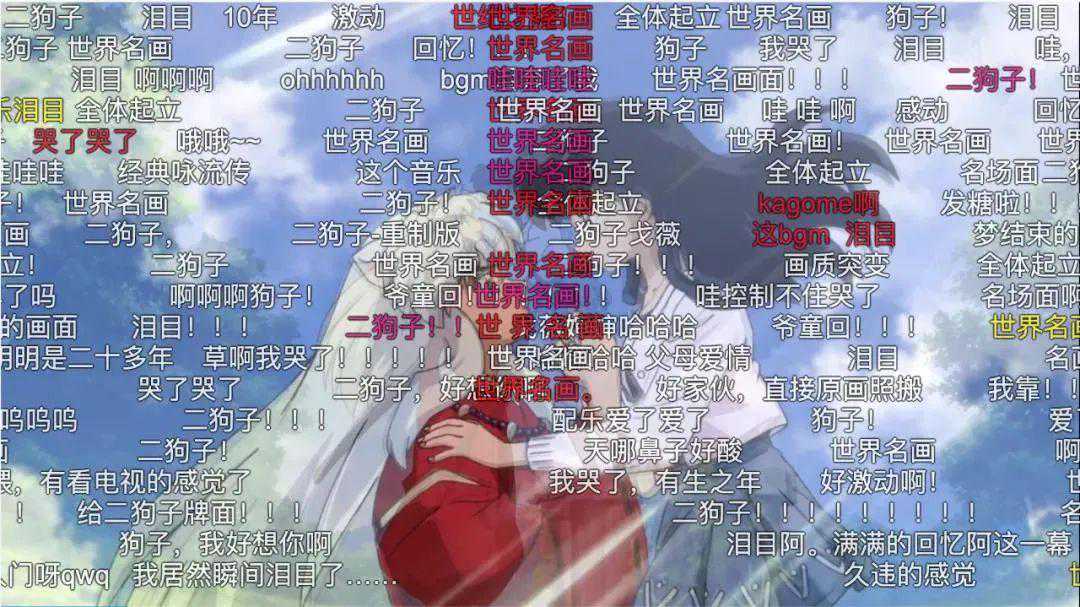 戈薇从古井中穿越而来,双手交给犬夜叉,落入那个坚实的怀抱,与弹幕一片“世界名画”完美定格。