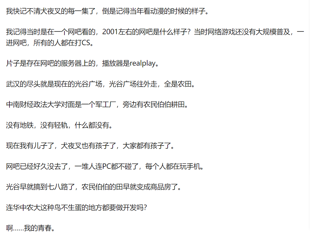 就像有人即使已经不记得《犬夜叉》的每一集了,但仍记得当年看动漫时候的样子。