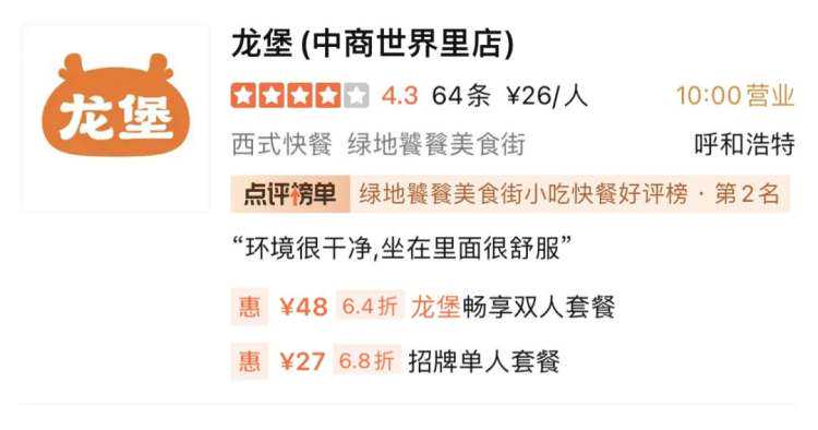 大众点评公开信息则显示,目前“龙堡”在呼市的第一家店已经开门迎客,延续了西贝系列餐饮的中端定位路线,一个汉堡的均价在25至30元,与此前的贾国龙中国堡基本相当,和麦当劳、肯德基等洋快餐品牌也差不多,比同样专注于中式汉堡的塔斯汀则略高一些。