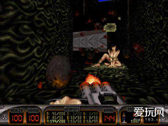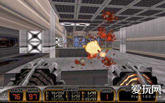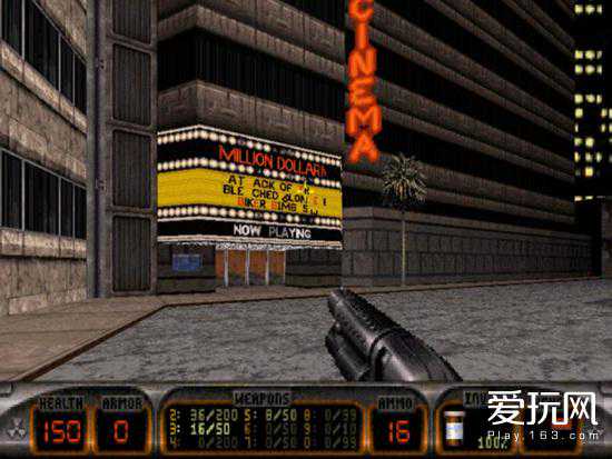 其次游戏场景中的互动内容也明显多于同时期的其他FPS,在它的竞争者们还只能想到装个开关控制大门、搞块玻璃供玩家打碎的年代,3DRealms的天才们已经开始思考在第一人称环境下该如何与场景里的物品进行更深层次的互动。于是我们在《毁灭公爵3D》里可以看到拓展视野的灯光,被打碎后能够回血的消防龙头,以及最著名的给脱衣舞娘小费让对方为你“敞开胸怀”这一特殊动作。
