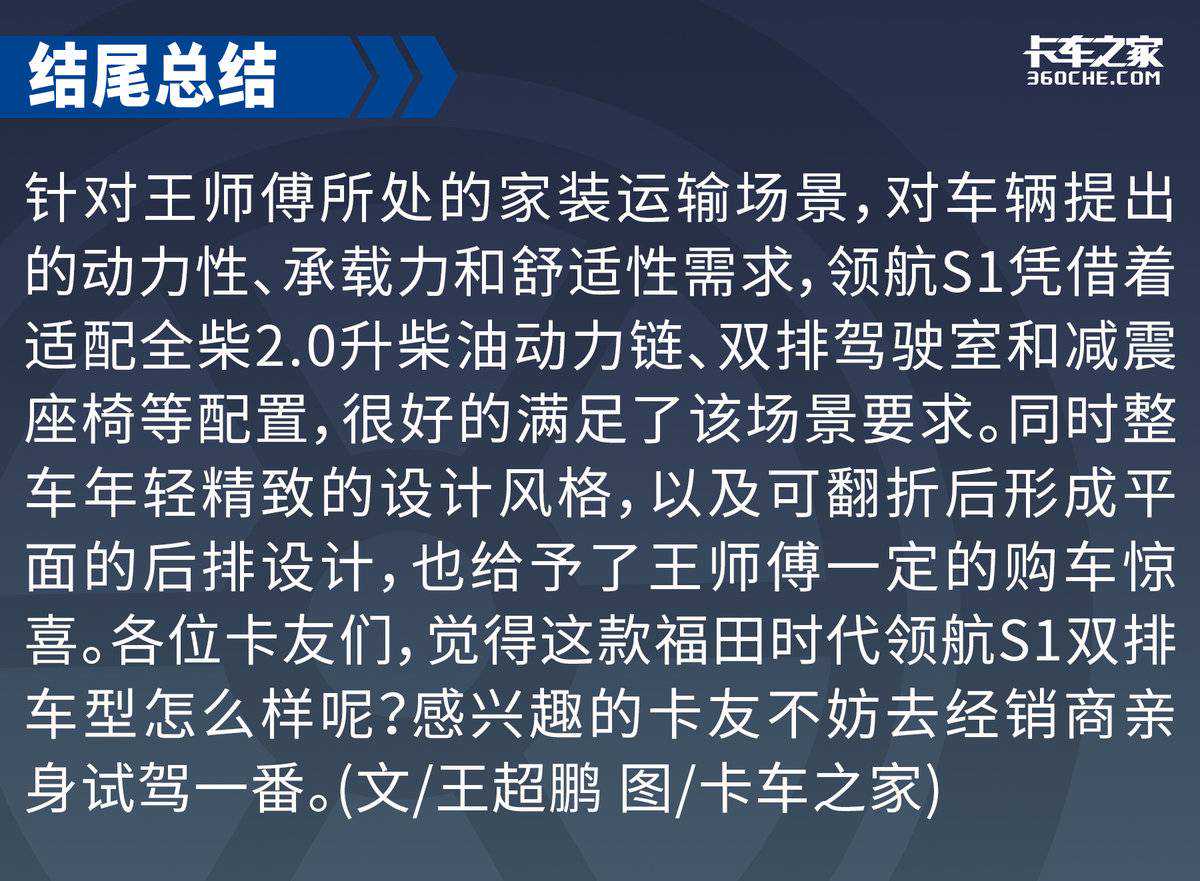 可见王师傅的家装运输场景,以及他个人对即将要换购的双排轻卡,在整车设计、承载力、动力性和舒适性方面,提出了诸多用车需求。下面让我们带着这些需求,来看看福田时代领航S1双排轻卡匹配如何,能不能满足王师傅的用车场景需求。