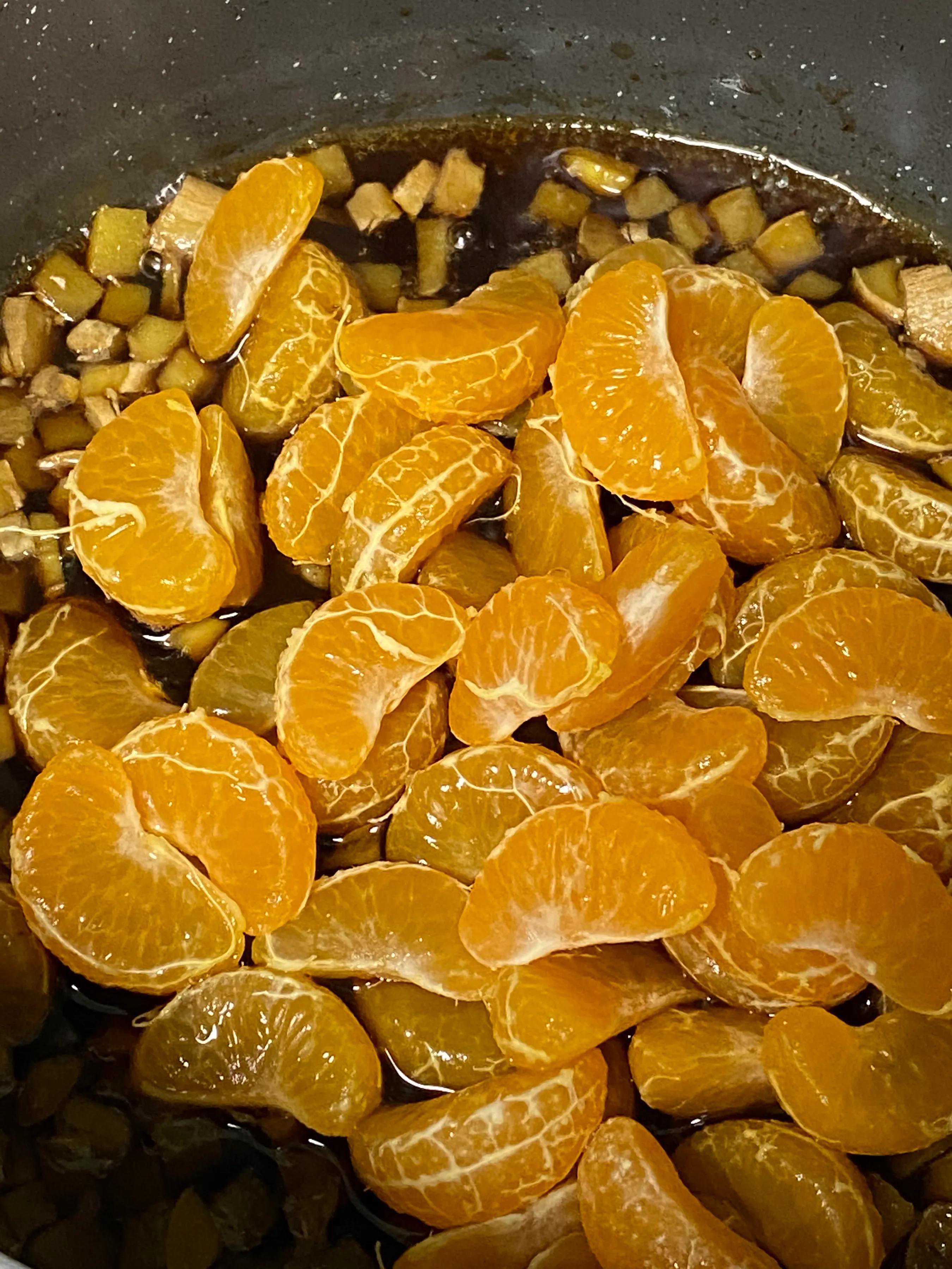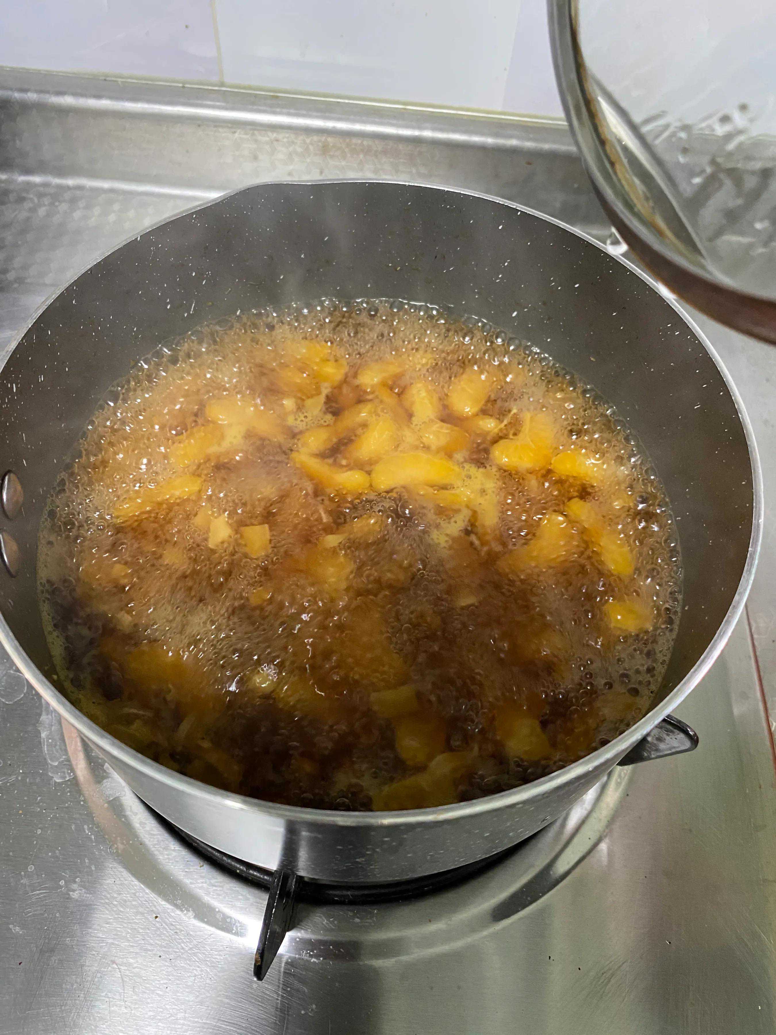 掌握到闻到糖的焦香了,下姜丁一同拌炒。姜味有了,再把桔子肉放进去!