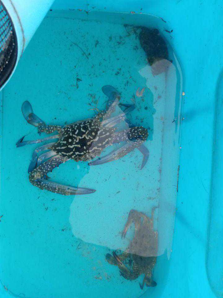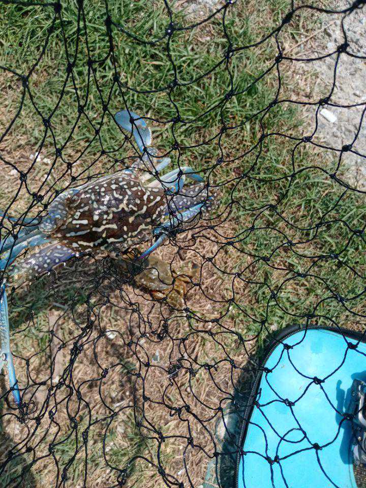 在上了7-8尾小鲷鱼后,这时浮漂来了一个斜走,扬杆时的感觉很奇怪,那就像钩到垃圾袋的感觉,但凭感觉我就知道这肯定是中螃蟹了,对螃蟹中钩,拉的时候一定要稳,不能像中鱼那样猛拉,这样很可能会把钩子从蟹身上抽出来,所以在小心翼翼的把它拉出水面后在小心翼翼的用抄网把它们抄上来,至于为什么用“它们”这个词,你仔细看,这次俺可是双飞螃蟹的哦