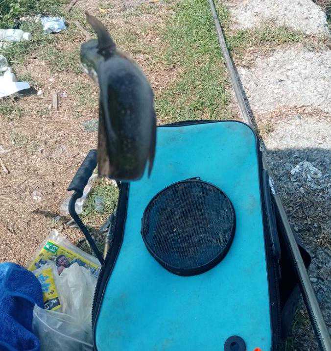 也许它听到了俺的呼唤,只见眼前的浮漂一个给力的下顿,扬杆时水下传递过来的是熟悉的感觉,溜鱼时是惊险刺激的过程,上岸后是完成任务般的喜悦,它就是这边钓鱼人都喜欢钓的,外号“水中鱼雷”的乌头鱼!这次来了个双保险中鱼,钩子一个正口,一个搭在尾部,难怪溜起来真带劲哦
