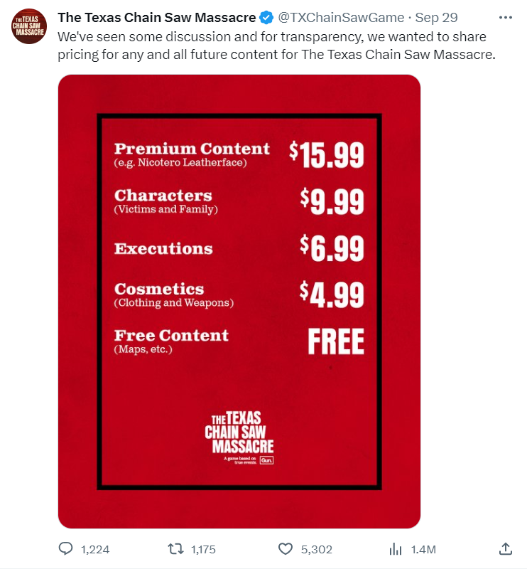 IT之家9月30日消息,《德州电锯杀人狂》官方表示为了透明度,公布了未来所有内容的定价。