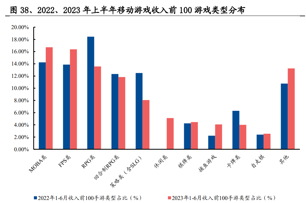 综合来看,海外策略类(含SLG)收入最高,国内MOBA类收入最高,而RPG类和FPS类在国内外收入均位于前三名。2023年1-6月海外前三类型共占比59.86%,2023年1-6月国内前三类型合计占比46.66%。其次是回合制RPG类、SLG类、休闲类、棋牌类、捕鱼类、卡牌类和放置类(自走棋)游戏;此外,还有SIM类、ACT类等。