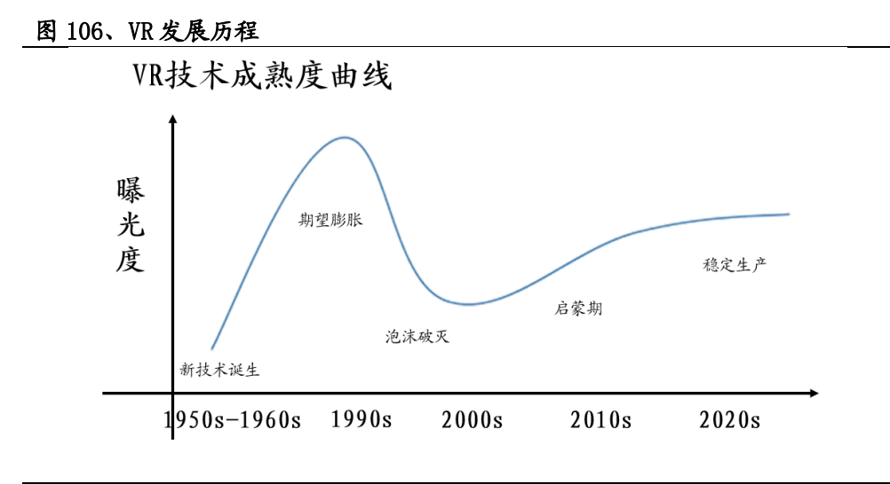 2012年OculusRift问世,重燃公众对VR的兴趣,VR发展进入第二次热潮。2014年,Google发布了其VR体验版解决方案:CardBoard;2015年,HTCvive在MWC2015上正式发布;2016年,索尼公布PSVR;2020年PECO旗舰产品PicoNeo2横空出世,加之疫情催化,再次助推VR/AR市场增长,根据IDC报告数据显示,2021年全年全球AR/VR头显出货量达1123万台,同比增长92.1%,其中VR头显出货量达1095万台,突破年出货量一千万台的行业重要拐点;2022年,VR硬件开启井喷,PICO的PICO4、Meta的MetaQuestPro、华为的VisionGlass、大鹏VR的大朋E4陆续亮相;2023年,索尼的PSVR2于2月发售,苹果MR头显RealityPro在2023年6月6日年度开发者大会发布,以空间环境感知、虹膜识别、空间音频射线追踪等先进技术,开启空间计算新时代;此外,MetaQuest3也将于2023年秋季发售。随着VR硬件产品的持续迭代,或将带来VR硬件的新一轮普及热潮。