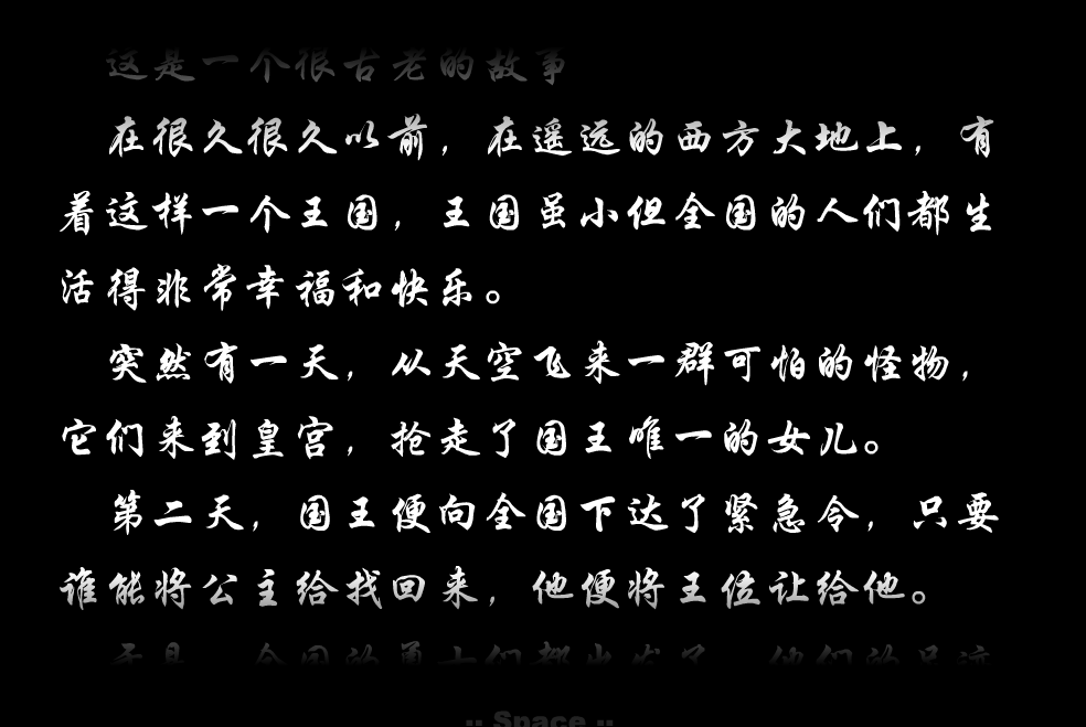 还是那个桥段,公主被怪物抓走了,国王便宣布谁能救回公主就把王位传给他。于是我们的故事就开始了,主角勇士登场!