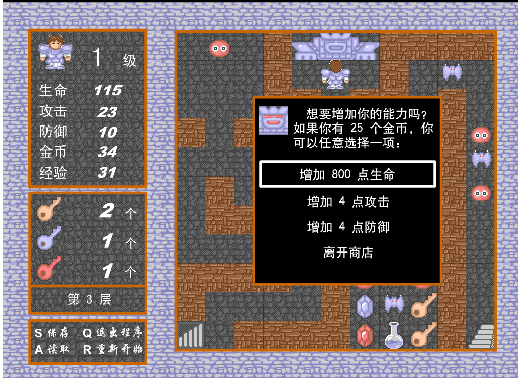 我们可以看到这个商店是可以花25金币购买任一一项能力,一个是+800血,一个是+4点攻击,还有个是+4点防御。注意这种商店是唯一能把金币转化成战斗力的地方,所以我们差不多所有的金币都要在这种商店花掉。这里我们血量太少,所以选择+800点血。