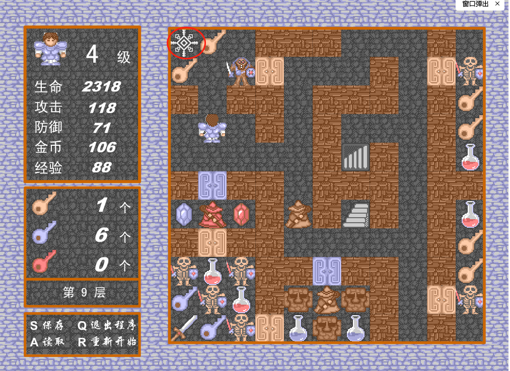 接下来我们来到第九层,注意这个雪花状的东西,它的名字叫风之罗盘,我们可以用一把红钥匙优先获取它,他可以让我们迅速上下楼。有了它,我们可以迅速到3楼或者5楼,花费金币或者经验购买能力。