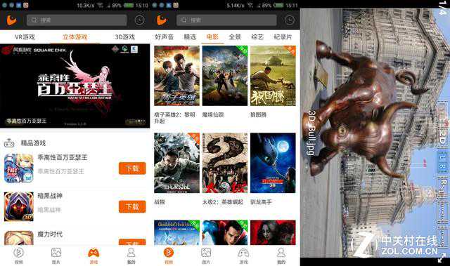 除了3D电影,3D游戏资源也非常丰富。同样在刚才的“3D东东”里面,提供了VR游戏、立体游戏、3D游戏供用户下载,其中不乏可以见到目前的一些热门游戏被转制成了3D游戏,可以说在内容建设方面丝毫没有落后。