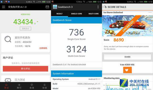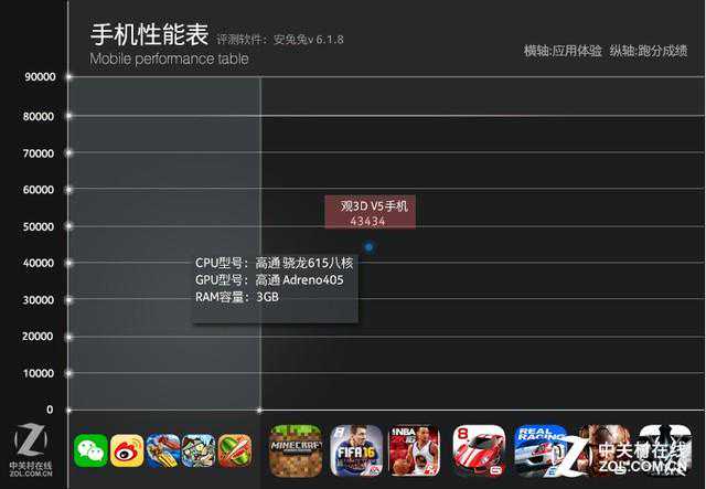 性能是每一部手机都要面对的问题,几年间手机网游的兴起甚至使得上了年纪的用户都开始手机上斗地主、玩消除了。观3DV5手机使用安兔兔测试综合成绩得分43434,对于大部分用户来说足矣,运行一些3D游戏也应该不成问题。