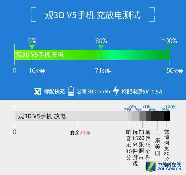 续航方面,观3DV5手机经过我们ZOL标准测试后剩余电量71%,对于一款有着3000mAh的手机来说这一成绩中规中矩,与目前市面3000mAh手机相比成绩相当,这一测试大致相当于轻度用户一天使用情况,对于普通用户以及重度用户来说一天续航也是可以扛得下来的。