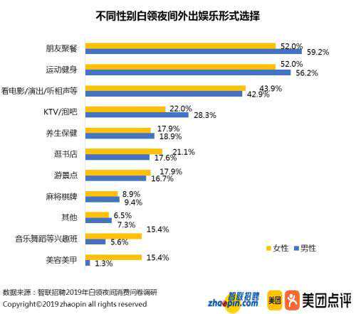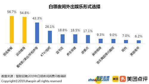 对于夜间外出娱乐的白领,朋友聚餐是首选。其次是运动健身,各类演出、唱歌泡吧的群体也占有一定比例。