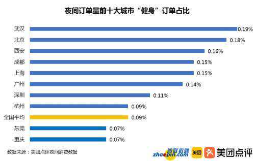 除了大快朵颐,夜晚总少不了一群为身材和健康努力着的白领们。数据显示,武汉白领最爱健身,健身订单占全市总订单的0.19%,其次为北京0.18%与西安0.16%。