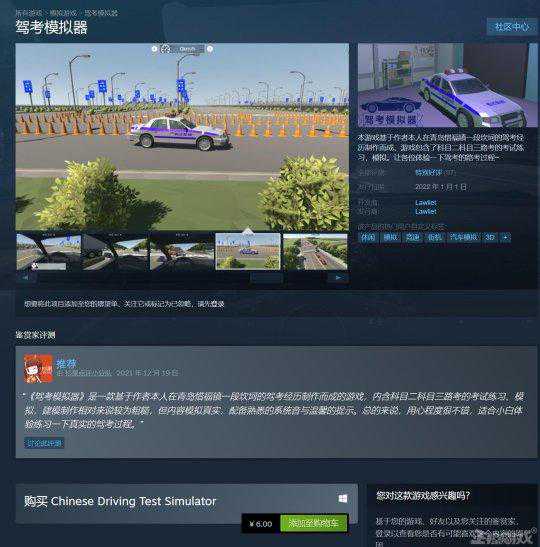 根据作者自己描述,这款游戏基于作者在青岛惜福镇一段坎坷的驾考经历制作而成,游戏包含了科目二科目三路考的考试练习和模拟,目的是为了让玩家体验一下驾考的过程。目前这款游戏于1月1日上线Steam,售价6元。