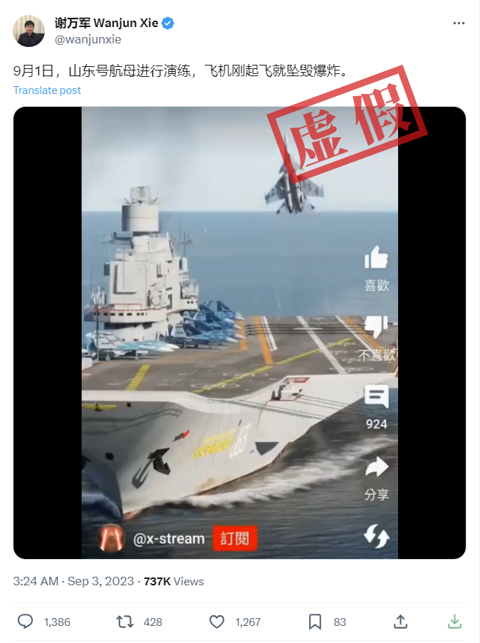 截至9月12日,除@wanjunxie的说法外,没有信息显示山东舰演练中有飞机坠海。