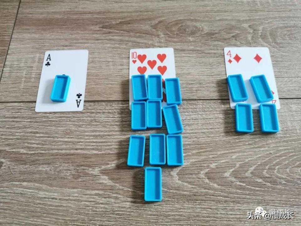 玩法:选四组1-10的扑克牌,用扑克摆出分解式。比如:家长说3,孩子就摆出3的分解式,并说出3能分成1和2,3能分成2和1。