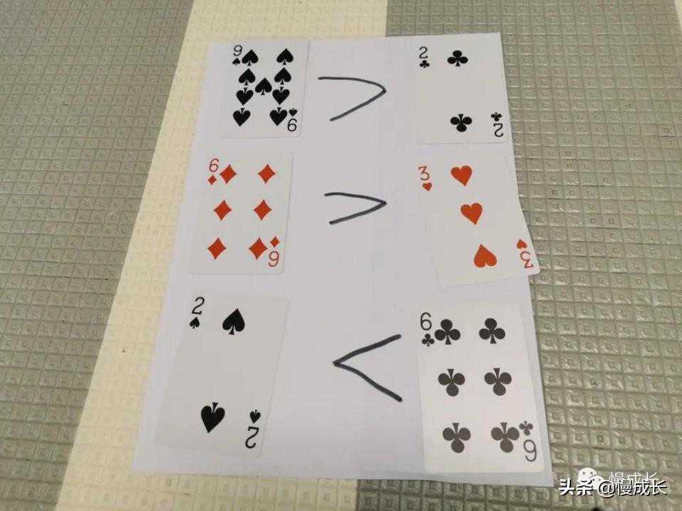 玩法:把牌平分成两堆,背面朝上。大人负责同时翻开两个牌堆上的扑克牌;如果左边的牌比右边的牌大,孩子就需要拍手,如果右边的比左边大,孩子就需要跺脚。