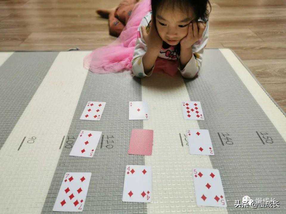 吉吉说:建议第一次玩,先从两张牌开始,然后逐渐加大难度,比如5张拿走1张、8张拿走两张;更难些的话,可以让孩子不仅说出“消失”的数字,还说出相应的花色。