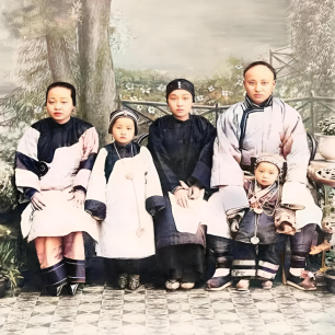 这是一个五口之家,几个人来到照相馆里拍全家福。男子很年轻,身旁坐着的是他的妻子。