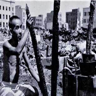 在日本本土遭受轰炸过后,一名日本男子来到已经变成废墟的房屋,眼中充满了悲伤,但这就是作为侵略者的下场。