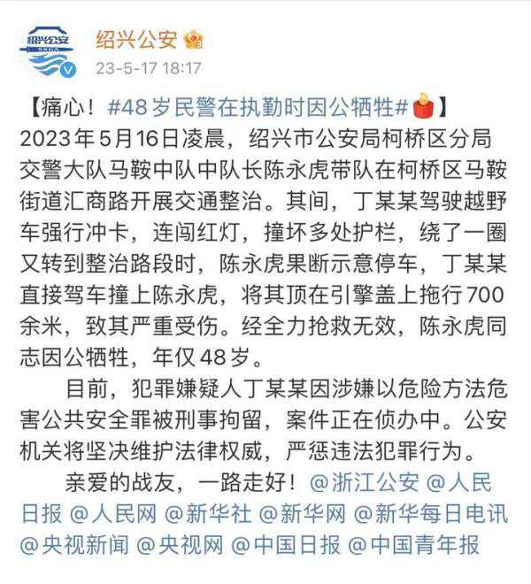 刚刚,据绍兴警方通报:2023年5月16日凌晨,绍兴市公安局柯桥区分局交警大队马鞍中队中队长陈永虎带队在柯桥区马鞍街道汇商路开展交通整治。其间,丁某某驾驶越野车强行冲卡,连闯红灯,撞坏多处护栏,绕了一圈又转到整治路段时,陈永虎果断示意停车,丁某某直接驾车撞上陈永虎,将其顶在引擎盖上拖行700余米,致其严重受伤。经全力抢救无效,陈永虎同志因公牺牲,年仅48岁。
