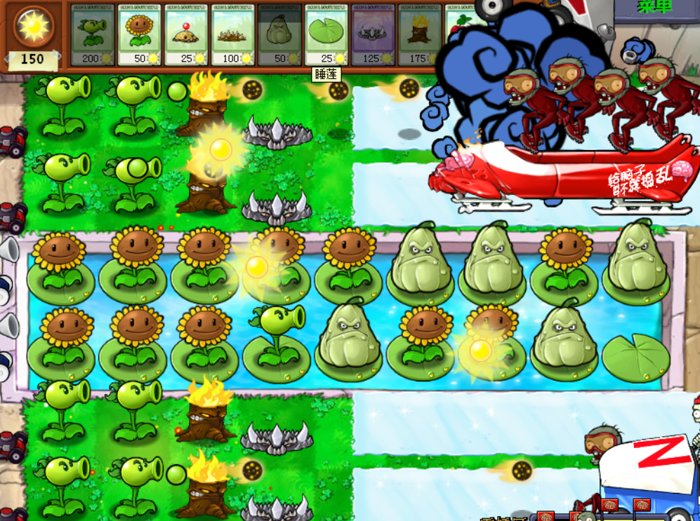 还是那句话,太阳是植物们战斗的资本。由于水池不是僵尸进攻的重点,植物们在水池广泛种植向日葵,已获得足够的太阳供给。有了太阳,咱植物的身板自然是硬邦邦的,来吧,雪橇车僵尸,植物正等着你!