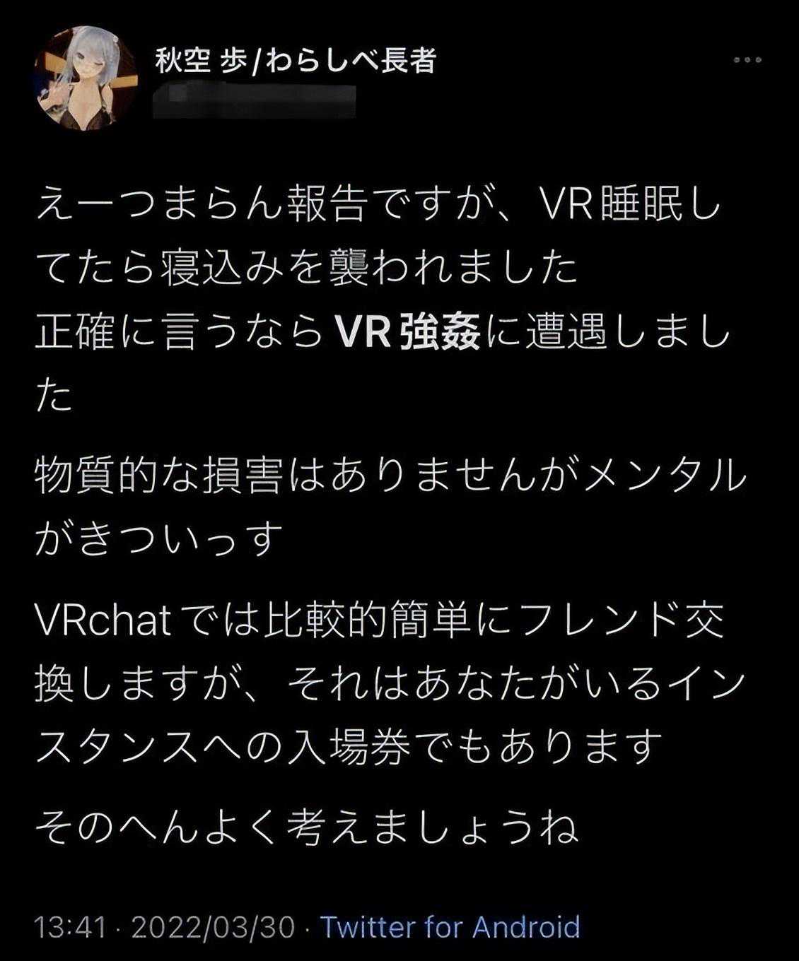 2022年3月,日本一个叫秋空的玩家,控诉说自己遭遇了“VR强奸”。