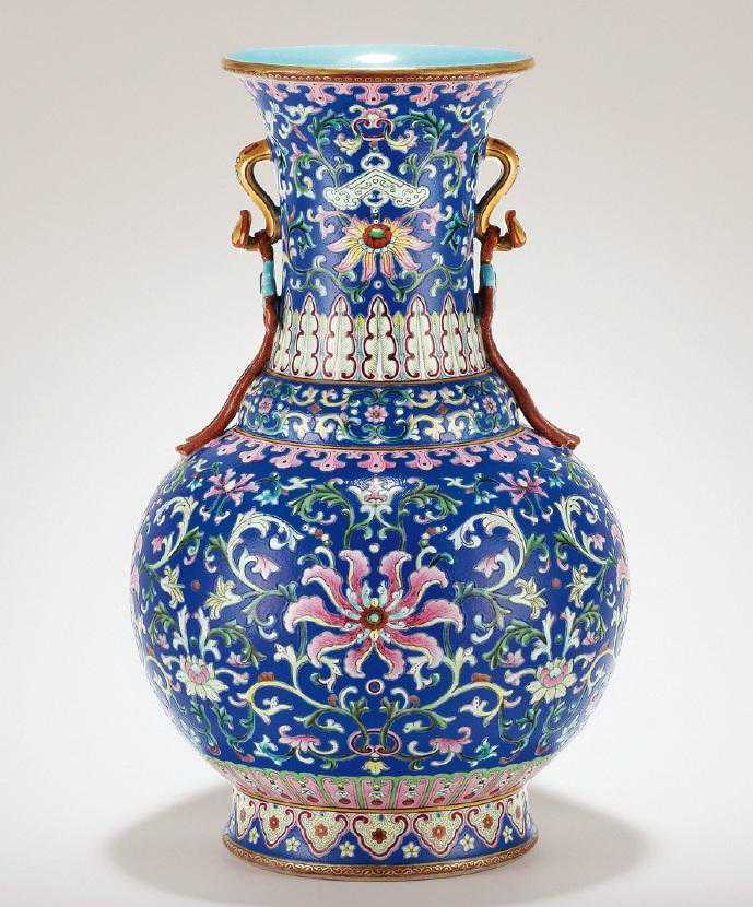 鼓腹,撇足,宽颈,口唇边!另外整个口型的器面都是用了皇室最顶级的珐琅描绘,这一种以宝石蓝为底的绘画方式,是属于乾隆时期宫内造办处最顶级的瓷器官所监督而烧制。