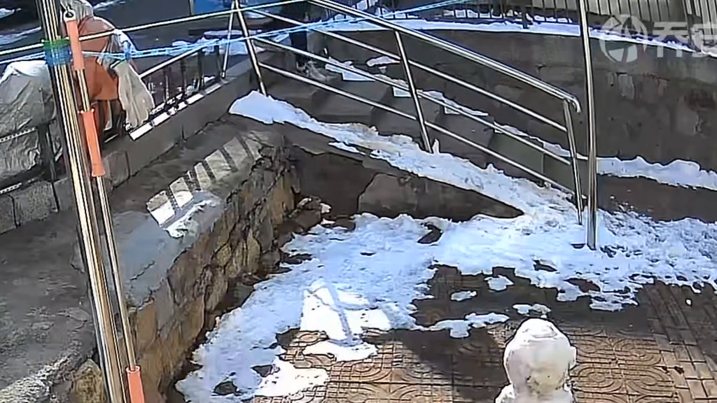 我们看他现在打好了水,沿着楼梯又折回来了,他这个还不死心非要把这个雪人给破坏了。先是东张西望,然后拎着这个盛满水的水桶直接就照着雪人的脑袋,一水桶就把脑袋敲掉了。然后他抱着水桶就跑了,他是跑得飞快,直接穿过马路直接就回到了隔壁的筒子楼里了。