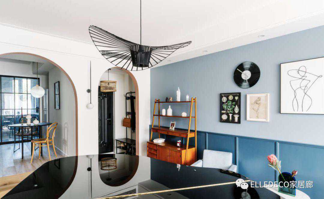 站在钢琴前看出去的视角,弧形门洞倒映在三角钢琴上的景象是意外之喜。将餐厅的墙拉长规划出一个玄关空间,放置了可以坐着换鞋的“鞋衣架”和储物的鞋柜。