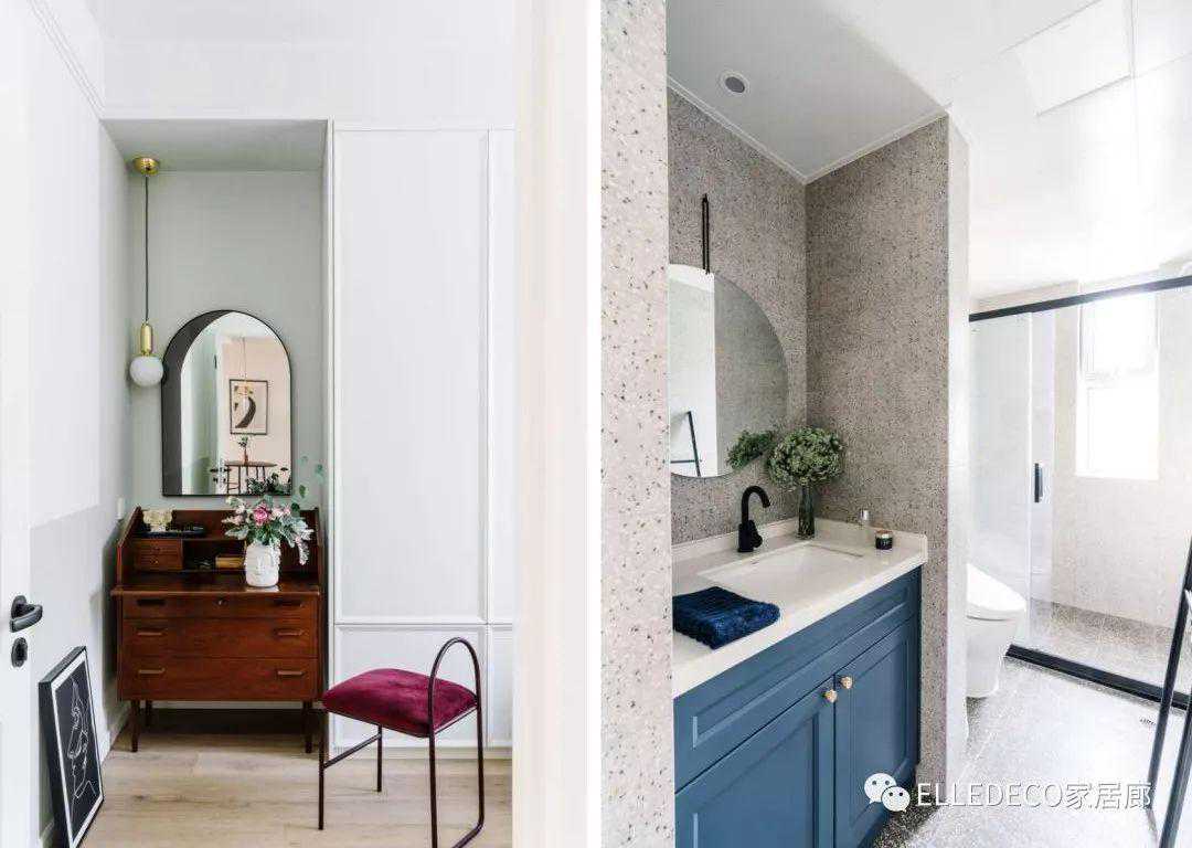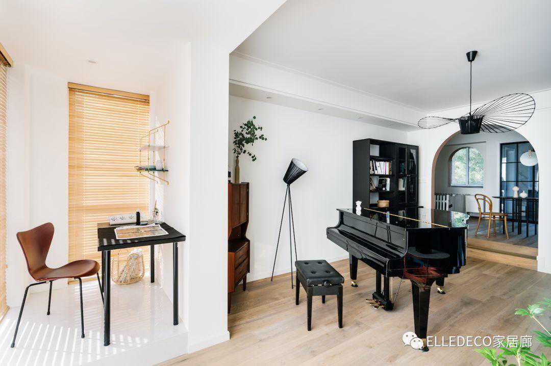 改造后,设计师将餐厅的墙拉长,既扩大了餐厅面积,又制造了一个玄关空间。去掉客厅原本的功能性,变成可以做喜欢的事情的空间,放一架钢琴,一个书法桌两人都有了可以独立使用的卧室及工作区域,把原本餐厅与阳台之间的窗户缩小成拱形窗,既留出窗景,又挡住杂物。