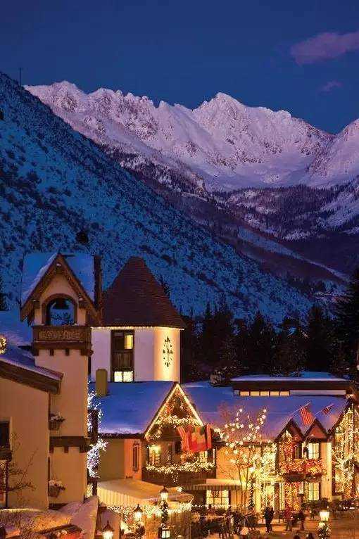 冬季的午夜,度假村的灯光被全部点亮,松树、尖顶、复古路灯、装饰雪花,整个韦尔滑雪场被装扮成童话中的城堡。