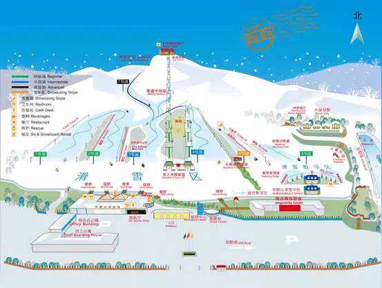 滑雪场由世界排名第一、设计过5届冬奥会比赛场地的加拿大Ecosign公司担纲设计,滑雪场总占地面积7平方公里,共有滑雪道43条,其中有满足冬奥会比赛要求的9条高级雪道,以及14条中级雪道,20条初级雪道,雪道总长度约30公里,总面积93.5万平方米,可同时容纳8000位滑雪者。滑雪场有7条索道,总长度达7.1公里,其中3条奥地利多贝玛亚6人吊椅脱挂式抱索器索道,2条法国法国POMA8人吊厢脱挂抱索器索道,2条国产4人吊椅固定抱索器索道,12条适合初学者的魔毯,每小时运力达到2万2千人。