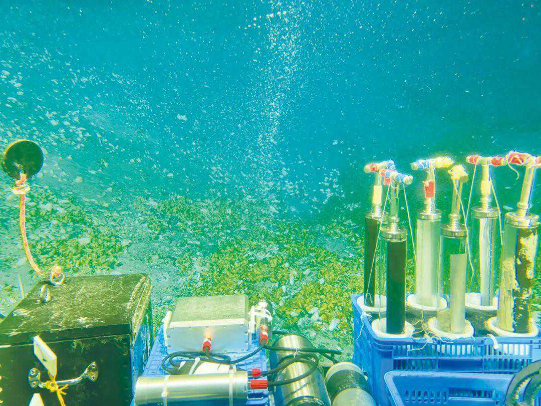 在近海底前行了约一个小时,一个冷泉喷口出现在眼前。“只见富含甲烷等主要成分的流体不断从海底往上喷发,产生了大量气泡,形成了几十米的气泡羽流,我一下子就想到了电视剧《西游记》中的龙宫。”靠近冷泉喷口,曹红被这种壮观的景象深深吸引。不过,仅仅隔了一天时间,当徐翠玲再次来到这个冷泉喷口处时,却发现已没有多少气泡了。“这鲜明地体现了冷泉具有易变性,一些冷泉可能仅仅过了几个小时就不再‘喷发’,但过几天或几个月又‘复喷’。”为了研究冷泉流体到底能在海水中漂多远,徐翠玲对冷泉喷口处的海水进行了分层取样,并利用甲烷传感器等装备对冷泉流体成分进行了测试,以待后续进一步研究。