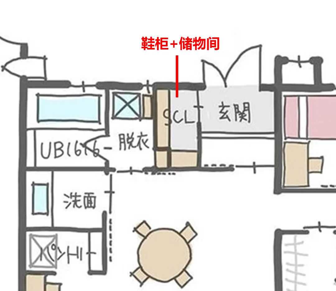 01│玄关储物间,与鞋柜合并若原始格局无玄关,没有隔断阻挡,相对方便设置储物间,能在大门侧面安一处走入式的储物间。