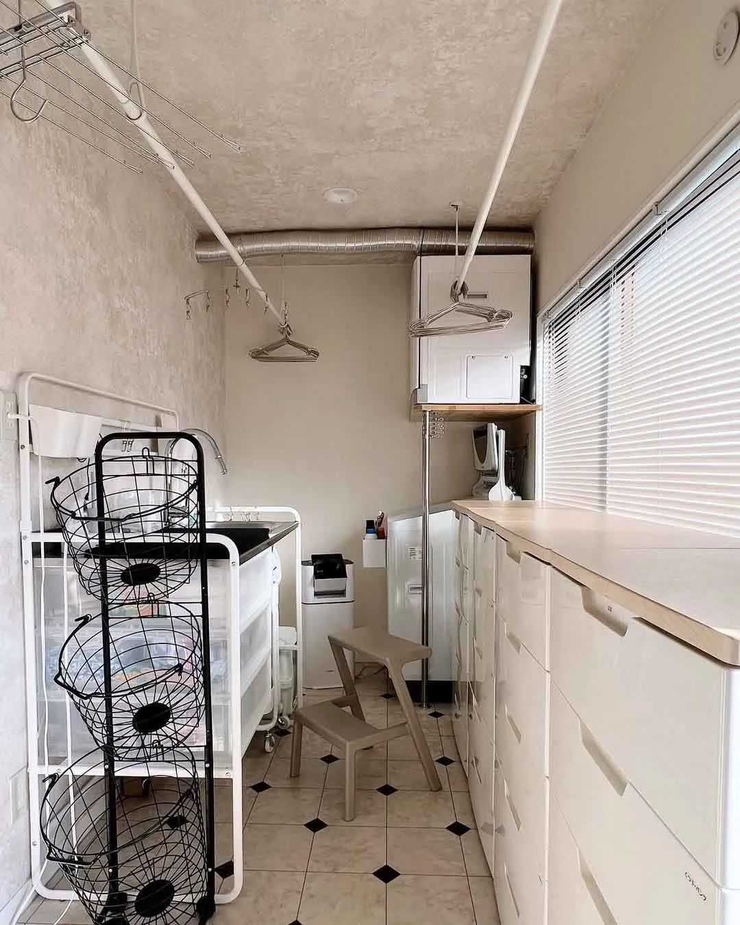 找不到空间能做储物间?不妨挪到阳台,阳台一侧能安排洗衣机、烘衣机,剩下的空间就留给储物间使用,结合洗衣、晾衣与储物的功能。
